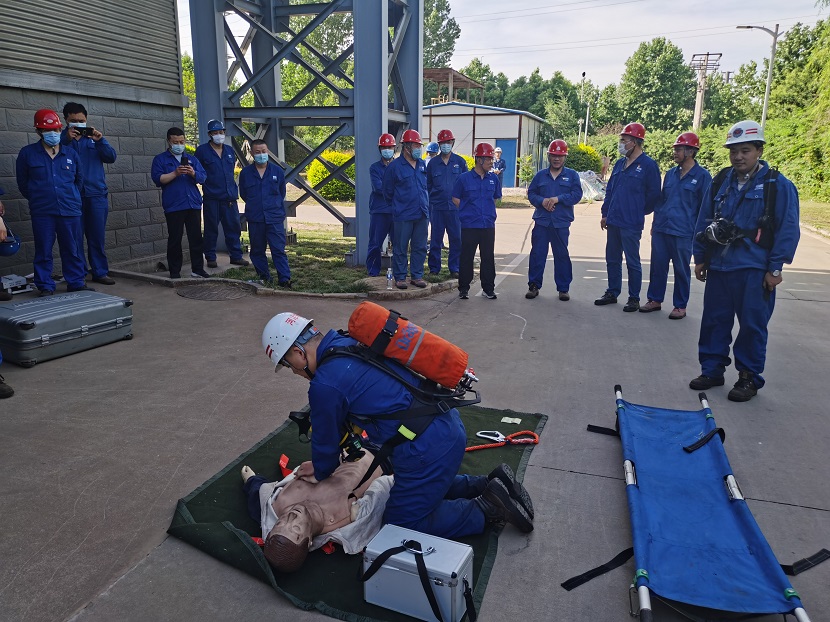 本次演練在公司安全總監(jiān)侯國(guó)棟的一聲令下,演練拉開(kāi)序幕,由公司應(yīng)急救援隊(duì)組成的現(xiàn)場(chǎng)作業(yè)組、應(yīng)急救援組、疏導(dǎo)警戒組、醫(yī)療救護(hù)組等4組演練人員開(kāi)展救援工作,相繼展示了事故發(fā)生后的事故報(bào)告、現(xiàn)場(chǎng)秩序維護(hù)、氣體檢測(cè)、救援三腳架搭設(shè)、安全防護(hù)裝備佩戴、通風(fēng)設(shè)備使用、人員救護(hù)等應(yīng)急處置全過(guò)程。
