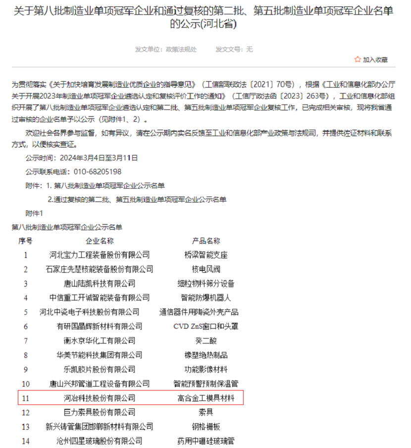 根據(jù)《工業(yè)和信息化部辦公廳關(guān)于開(kāi)展2023年制造業(yè)單項(xiàng)冠軍企業(yè)遴選認(rèn)定和復(fù)核評(píng)價(jià)工作的通知》(工信廳政法函〔2023〕263號(hào)),工業(yè)和信息化部組織開(kāi)展了第八批制造業(yè)單項(xiàng)冠軍企業(yè)遴選認(rèn)定和第二批、第五批制造業(yè)單項(xiàng)冠軍企業(yè)復(fù)核工作,已完成相關(guān)審核,河冶科技股份有限公司被認(rèn)定為第八批制造業(yè)單項(xiàng)冠軍企業(yè)。